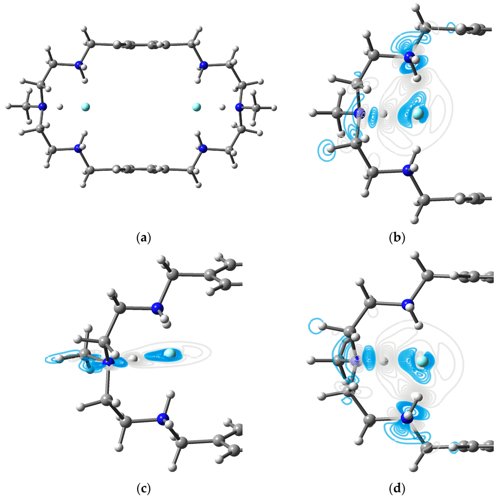 Two fluorides encapsulated by the azamacrocyclic compound. (a) Optimized [H6LF2]4+ structure; (b) electron density differences (Δρ) maps of HB1 in the plane of N1–H–F1; (c) electron density differences (Δρ) maps of HB2 in the plane of N2–H–F1; and (d) electron density differences (Δρ) maps of HB3 in the plane of N3–H–F1. Contours in the deformation density map are shown at ± 0.001 au. Grey lines indicate deficiency of density, and blue lines indicate increasing density. Δρ = ρ([H6LF2]4+ − ρ[H6L]6+ − ρ(F2)2−.