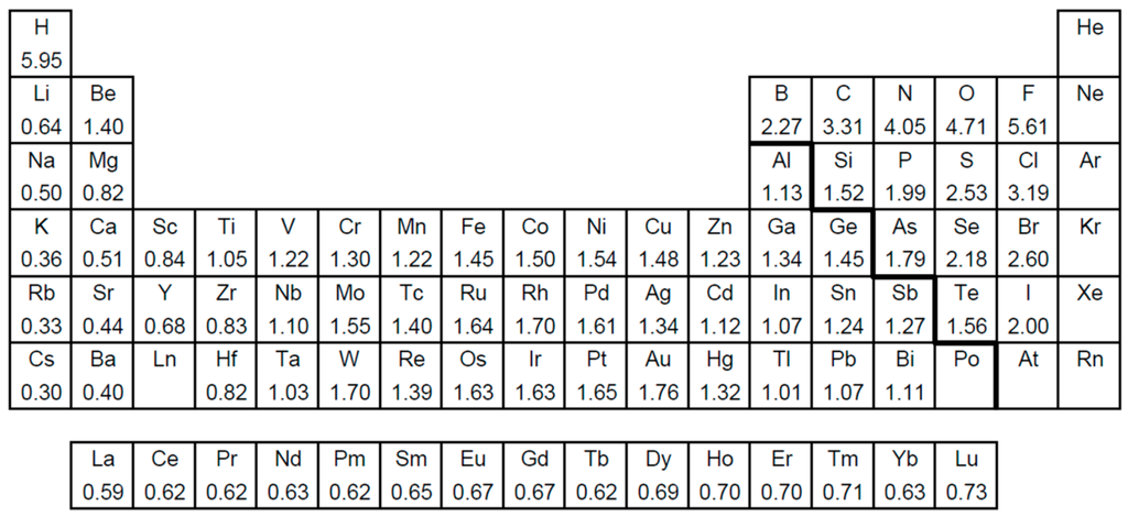 The chemical index values calculated using Pauling electronegativity values and metallic radii (when available) across the periodic table. Covalent radii are used for those non-metal elements that do not have a standard metallic radius.