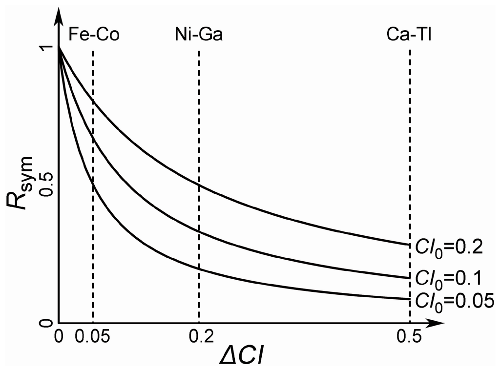 Figure 3 illustrates the effect of varying the parameter, where three pairs of elements are shown to represent some typical values for . For the smallest values, the mixing between elements falls steeply as their difference in chemical index increases, while larger values leads to more substantial mixing. For intermetallics, we have found works well for most intermetallic systems, since it provides strong differentiation between chemically distinct metallic elements (e.g., Ca and Tl), but still allows for a reasonable degree of mixing between chemically similar atoms (e.g., Fe and Co). The user could also tune the extent of mixing between elements through this parameter, which adds to the flexibility of the algorithm.