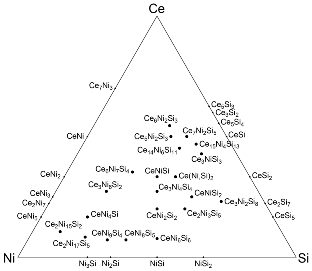 The solid state compounds with known crystal structures in the Ce-Ni-Si phase diagram at 673 K (above 33.3 at. % Ce) or 1073 K (below 33.3 at. % Ce) [].