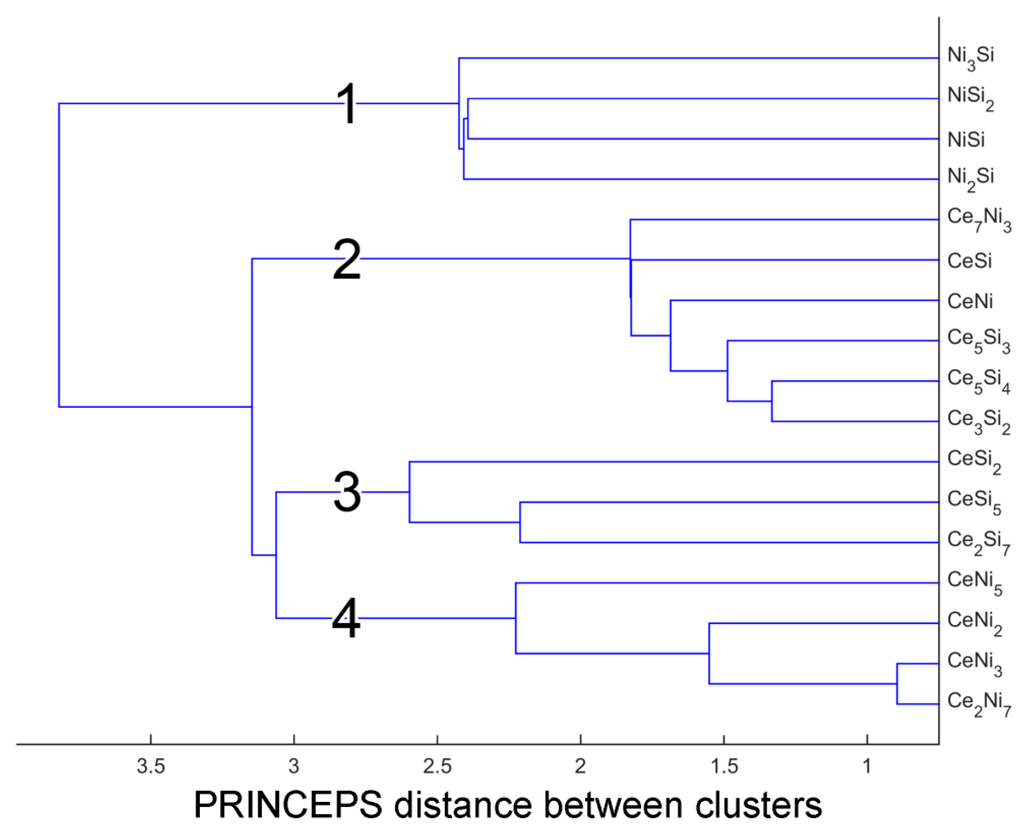 Similarity dendrogram of all binary phases in the Ce-Ni-Si system generated by PRINCEPS. Each major branch (labeled 1 through 4) corresponds to a cluster of similar binary phases. The x-axis shows the distance between clusters: branches joining at a shorter distance bear higher similarities to each other.