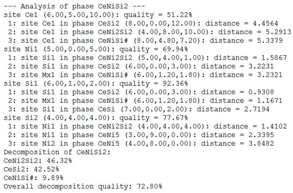 In this output, the program goes site-by-site through the phase analyzed, and annotates each site label with three numbers in parentheses giving the number of atoms of each element type in its CE (the site’s coordination vector). For example, Ce1 in CeNiSi2 has 6 Ce, 5 Ni and 10 Si atoms in its CE. These numbers can be fractional, which indicates mixed occupancy of certain sites in the structure. A site “Mx1” can also be found in the output, which corresponds to the mixed occupancy site Ni1/Si1 in Ce(Ni,Si)2 (the CeNiSi# structure in the output).