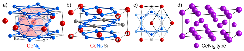 - Bodak, O.I.; Gladyshevskii, E.I. Crystal Structure of the Compound CeNi8.6Si2.4 and Related Compounds. Dopov. Akad. Nauk Ukr. RSR, Ser. A 1969, 452–455. [Google Scholar]