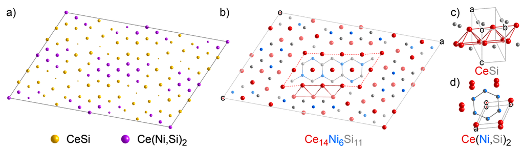 - Hovestreydt, E. Crystal Data for Ce14Ni6Si11 Isotypic with Pr14Ni6Si11. J. Less Common Met. 1984, 1, L27–L29. [Google Scholar] [CrossRef]
