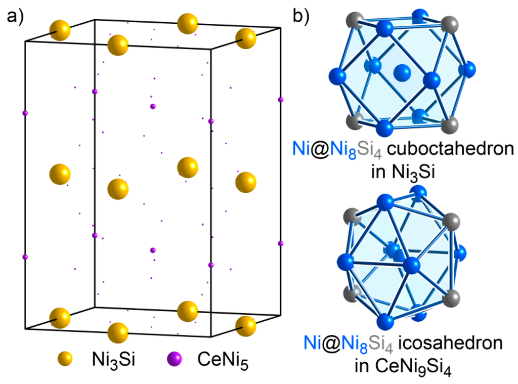 - Another difference between CeSi2 and Ce(Ni,Si)2 lies in their cell parameters: CeSi2 has tetragonal symmetry, so its a and b parameters are restricted to be equal (a = b = 4.156 Å), while Ce(Ni,Si)2 does not have such a symmetry constraint (a = 4.039 Å, c = 4.287 Å). For all three phases in the structural series, their two shorter cell axis lengths are almost equal, so the atomic CEs in CeSi2 is less distorted from the target atomic CEs compared to Ce(Ni,Si)2. This explains why CeSi2 takes up a higher weight than Ce(Ni,Si)2 in the decomposition of Ce3Ni2Si8 and CeNiSi2.