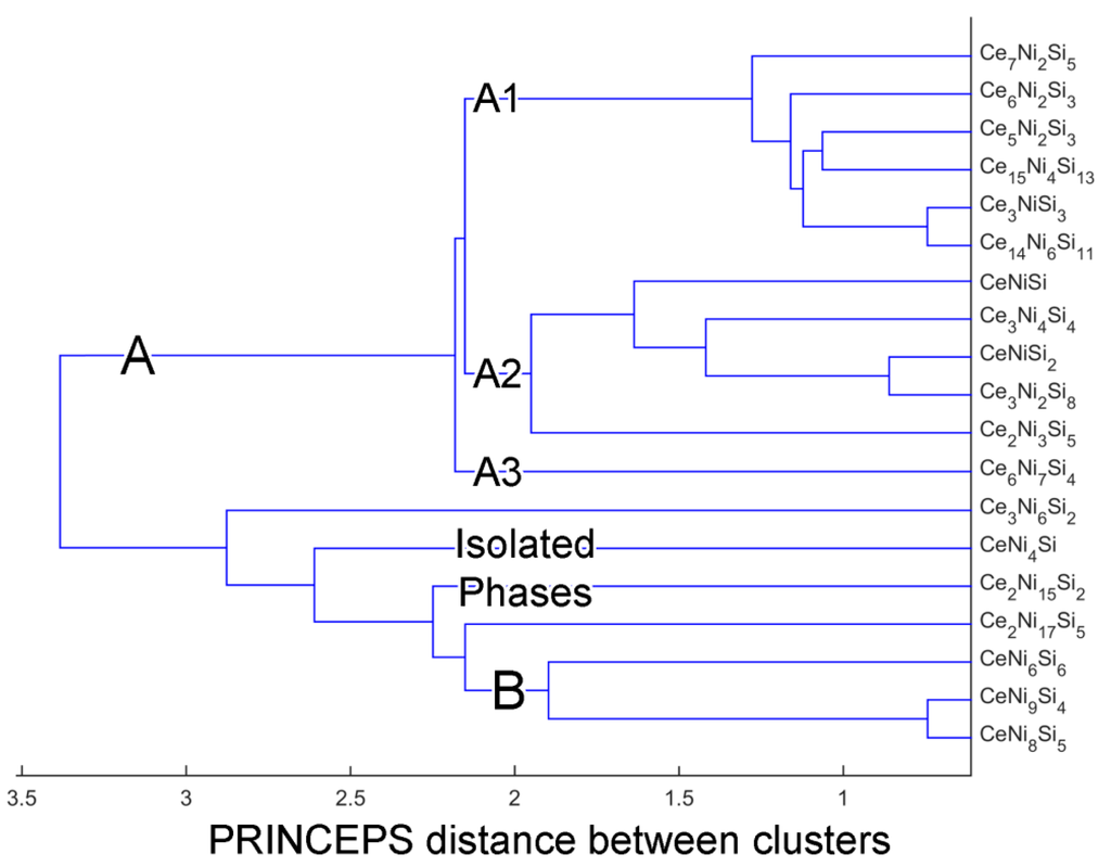 Applying such a clustering analysis on all binary phases [,,,,,,,,,,,,,,,,,] in the Ce-Ni-Si system yields four clusters: