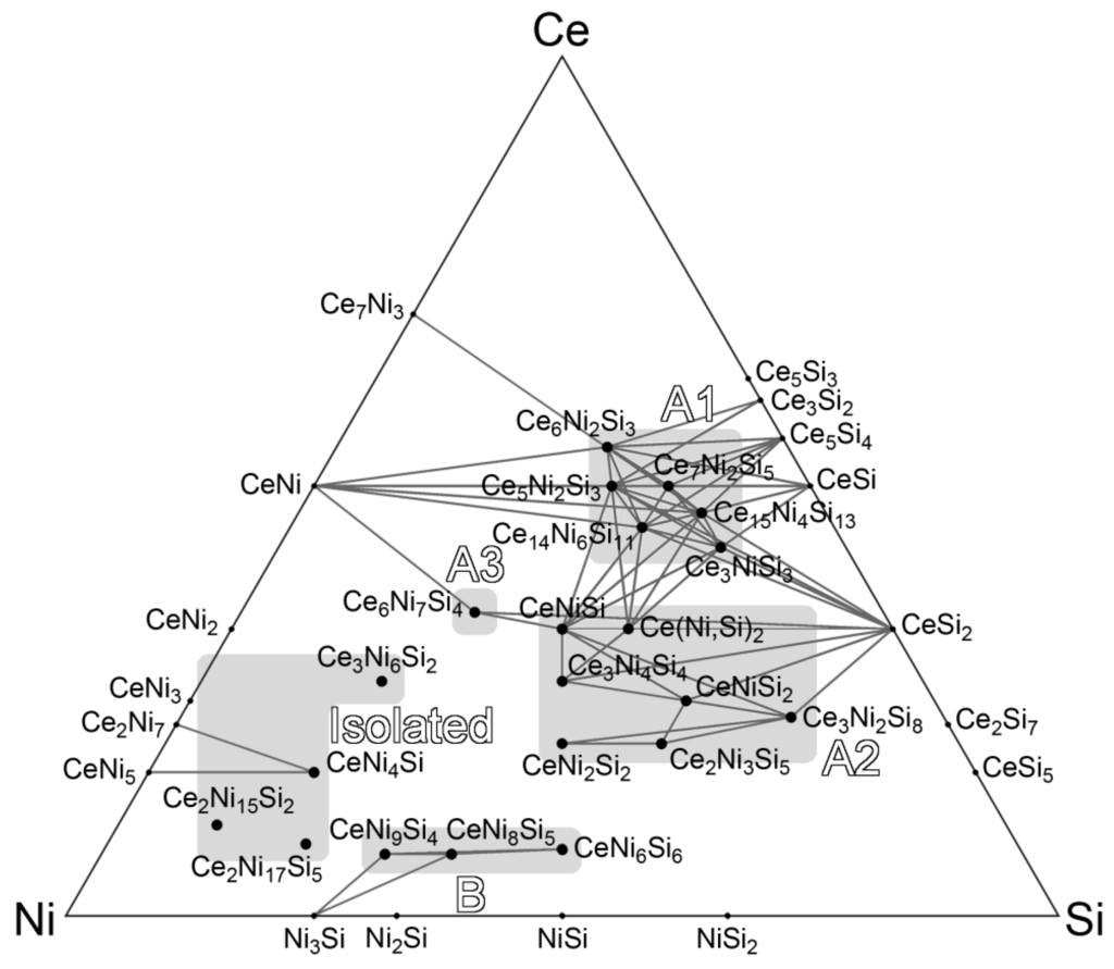 In this section, we will demonstrate how the above algorithm, as implemented in the PRINCEPS package, can be used in the rationalization of crystal structures in an exceptionally complex system: the Ce-Ni-Si ternary phase diagram (Figure 4) with 17 binary phases and 21 ternary phases. Many of the crystal structures of this system are well-described in the literature [,], which reveals rich interrelationships among its structures. In the following sections, we will see how PRINCEPS uncovers these patterns interconnecting the phase diagram’s seemingly chaotic scattering of phases, with minimal intervention on the part of the user. In this analysis, PRINCEPS will interpret the structural motifs of each complex ternary phase in terms of the simpler binary phases in the system, and recognize structural families based on common geometrical motifs.