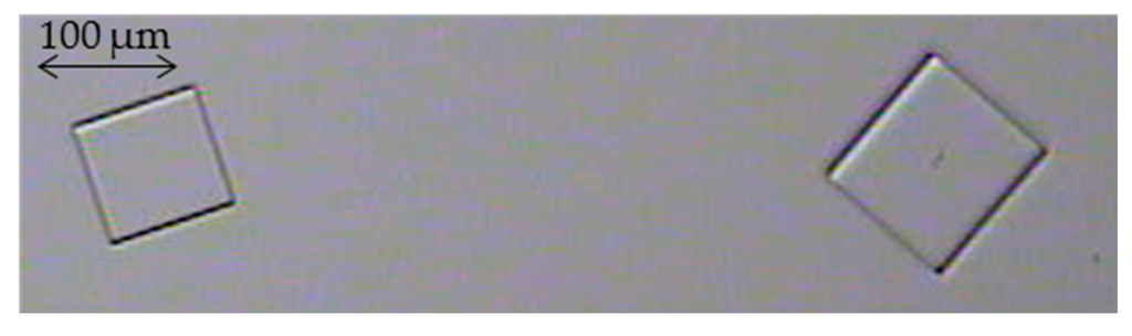 NaCl crystals were obtained at WRF of 87.8%, with CVs less than 38.6%. The produced crystals showed the characteristic cubic block-like form in accordance with the expected geometry of the NaCl crystals when examined visually with optic microscope (Figure 6). Low CV, like that achieved in MCr, is characteristic of a good product [25].
