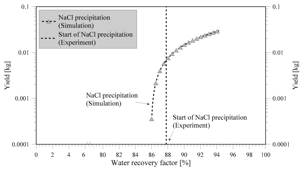 Good agreement between experimental tests and model (Figure 7), with deviations of only 2.09%, can be observed. The reason for the slightly later start of precipitation in the experiments with respect to simulation is due to induction time. The comparison of simulation and experiments confirms the validity of the simulation study done and its suitability for a preliminary screening of the potentialities offered by membrane crystallization in the mining industry.