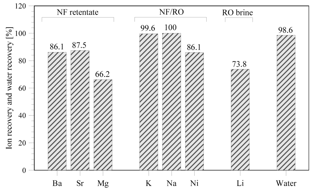 The overall efficiency of an integrated membrane desalination plant with MCr treating the NF retentate and RO brine is reported in Figure 8. Considering both the present thermodynamic simulation and the experimental results from earlier studies [17,23,25,28], it is assumed that some ions (including barium, strontium, and magnesium) can be more easily recovered from NF retentate. In case magnesium will also be recovered from RO brine, its recovery will be higher than the 66.2% (Figure 8). Since sodium can be recovered from NF retentate and RO brine, its removal percentage from seawater is near to 100%. NaCl has been extensively studied for recovery by membrane crystallization from NF retentate and RO brine, and therefore the separation has been experimentally verified (in the previous section and in literature [17,23,25,28]). Simulations indicate that potassium and nickel can also be recovered from NF and RO brine with a high percentage of recovery. However, these results require experimental validation. The higher amount of monovalent ions in the RO brine with respect to NF retentate indicates that 73.8% of lithium can be recovered. However, it should be noticed that, since the curve of lithium precipitation (Figure 4) has not reached steady state but is still increasing at the final studied water recovery factor, the amount of lithium recovered will be higher at increasing water recovery.