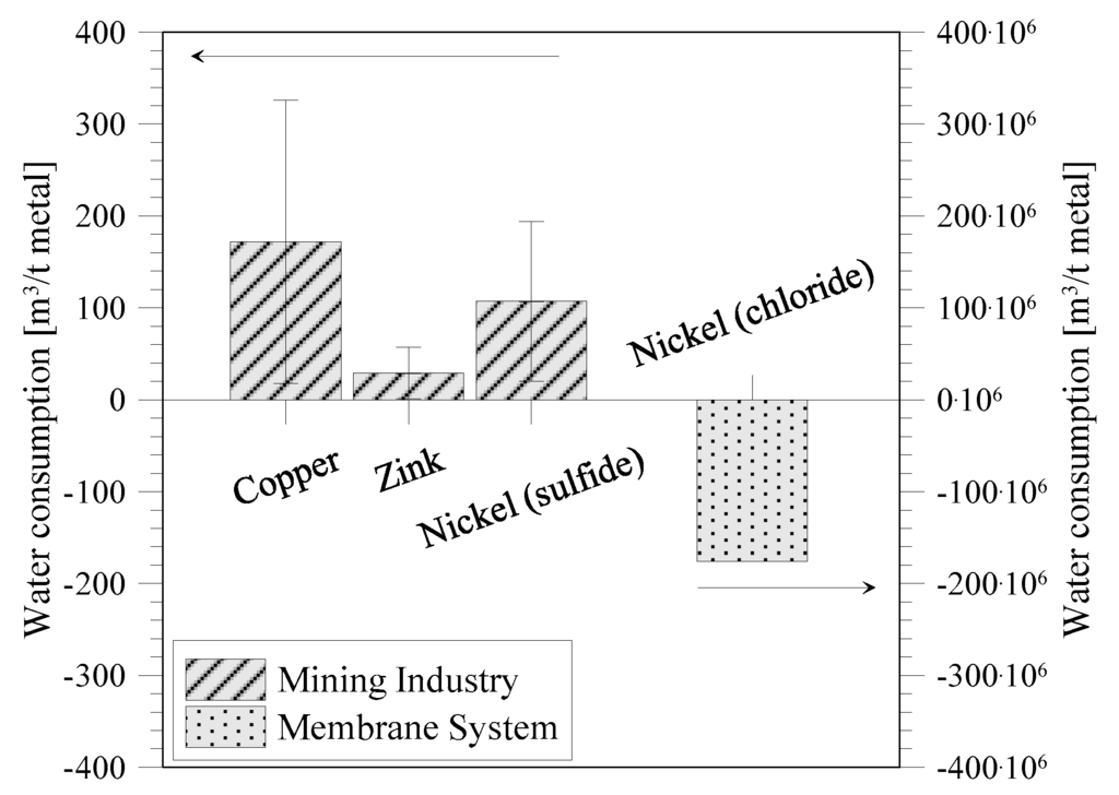 Figure 10 shows the comparison of water consumption for minerals recovery through (1) the conventional mining industry and (2) integrated membrane systems. Water in mining is used in a wide range of activities, such as mineral processing, dust suppression, slurry transport, etc. [34]. Mudd [35] made a preliminary study on embodied water for different materials coming from the mining industry with data available from the industry itself. The available data show that the embodied water is very high and with high standard deviations (as can be observed in the case of nickel). The high standard deviation is associated with the different mining sites and the difference in ore grade, open cut mining or underground mining, mill configuration and design, water quality, project age, climate, and length of slurry pipelines, which all affect the embodied water [35]. Although the mining industry has made many efforts and improved their water management significantly by closed loop water circuits, the water requirements are still very high. On the contrary, minerals recovery from the sea through integrated membrane systems has the great advantage that water is produced and not consumed. In particular, the amount of water produced in an integrated NF/RO/MCr system is much higher than the amount consumed by the conventional mining industry to recover one ton of nickel. However, high water production can only be obtained because of the low impact of concentration on MCr process performance, and that it is possible to avoid scaling. Depending on stream composition, proper pre-treatment and management of the operative conditions allow the control and minimization of scaling and fouling, to promote crystals formation in the precipitation tank and to avoid crystals growth on membrane surface [17,23,25,28,36]. From the precipitation tank, the crystals can be filtered and recovered. This kind of crystals recovery system has been developed in the study by Macedonio et al. [36]. Macedonio et al. [28] have previously highlighted the economic perspective of introducing MCr in desalination. In fact, due to the potential sale of salts (in this study NaCl and MgSO4·7H2O), the overall water production cost can be negative. Depending on if waste heat and energy recovery devices are available or not, the water production costs are found to be in the range of −0.49 to −0.71 $/m3 [28]. This emphasizes that MCr can prospectively be a very interesting technology for minerals recovery from desalination brine. Moreover, extending the number of salts to recover might also further enhance the economic benefits.