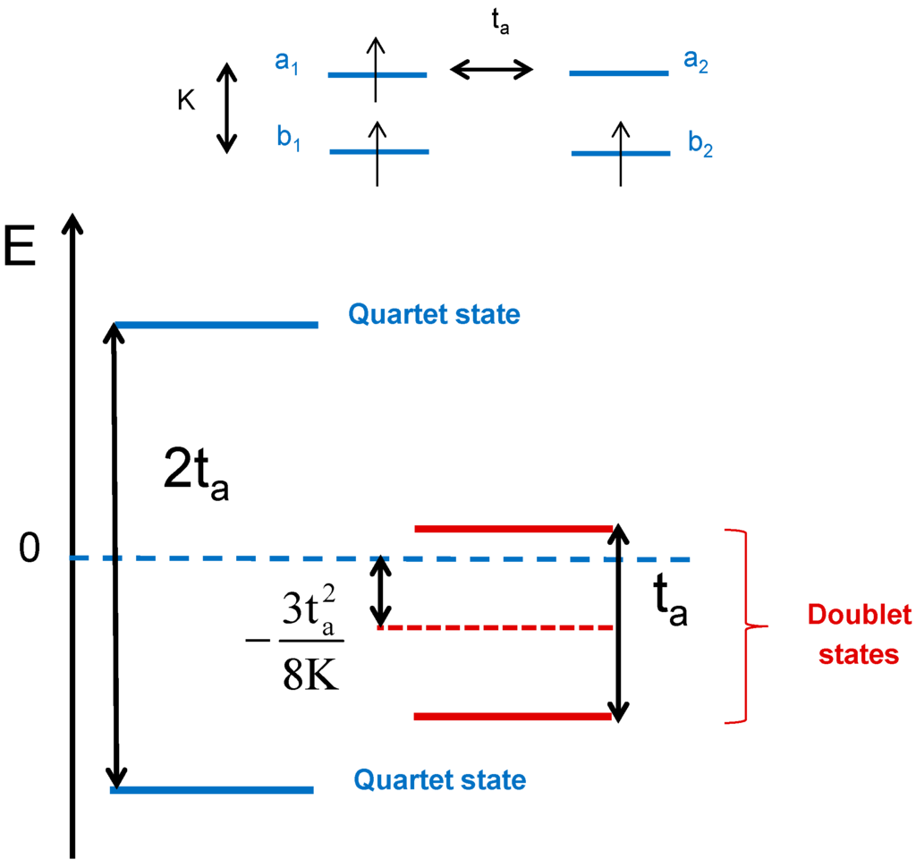 for a left-right symmetric compounds. The effect of the non-Hund states stabilizes the doublet states in comparison to the quartets. Finally, Girerd and coworkers [] have pointed out the fact that the upper multiplicity ground state loses the energetic benefit of the antiferromagnetic coupling between the electrons occupying the b orbitals. Refined models, combining the Anderson Hazegawa and the Girerd and Papaefthymiou mechanisms at work in the spectrum of the bi-nuclear complexes have been derived by the authors and coworkers [,,,,,]. The analytical expression of the energies of the two quartet and two doublet states are: