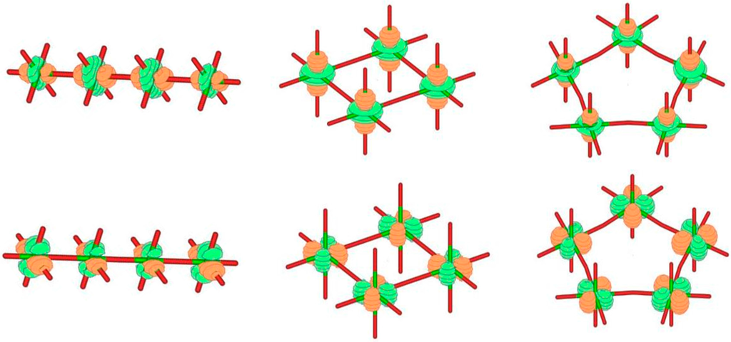 One may wonder whether a unique is considered. Indeed orbital order resulting in different interactions between the magnetic centers often appears in manganites, for which a two-orbital double-exchange model has been proposed []. Different values of can be used in our code but as the considered systems are spin chains and spin crowns with magnetic sites having two magnetic orbitals, real compounds to which our study applies could be made of Ni(II) ions in octahedral environment. In such systems, Jahn-Teller distortions are not likely to occur and quite symmetric architectures are expected. The here-reported study should also apply to systems presenting small chemical distortions. Figure 2 show molecular magnetic orbitals optimized at the Hartree-Fock level for the highest spin state for chains of four sites and crowns (rings) of four and five sites. Due to symmetry reason, these orbitals are linear combinations of atomic d orbitals (eg-like) having all the same overlap with their first neighbors. As is proportional to the overlap, a single hopping integral is obtained. It is interesting to note that the family of double-exchange states to which the ground state belongs has the hole delocalized in orbitals with the shape of in crowns and in chains.