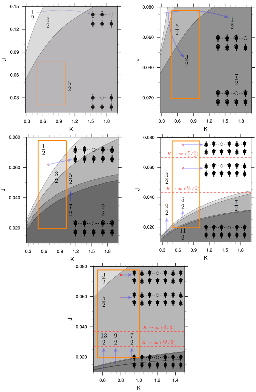 (From top to bottom and left to right) phase diagrams of system of three, four, five, six and seven sites for various values of the antiferromagnetic coupling and local exchange . Orange rectangles indicate the values of and in units of that are commonly found in magnetic compounds. The nature of the ground state is partially depicted by the determinants having the largest coefficient in the ground state wave function. The dotted red line represents the transition between the indicated spin states for the limit .