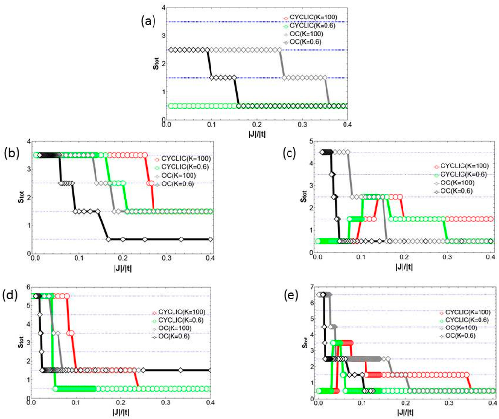 From top to bottom and left to right: Spin of the ground state as a function of the antiferromagnetic magnetic coupling for both open chains (OC) and cyclic chains with three (a), four (b), five (c), six (d) and seven (e) sites.