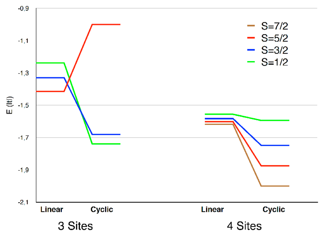 Low energy spectra of the linear and cyclic systems of three sites (left) and four sites (right) for and . For an even number of sites, the cyclization induces a stabilization of all the states and does not change the energetic ordering of the spin states. For an odd number of sites, the cyclization changes the energetic ordering of the spin states and destabilizes the highest spin state.