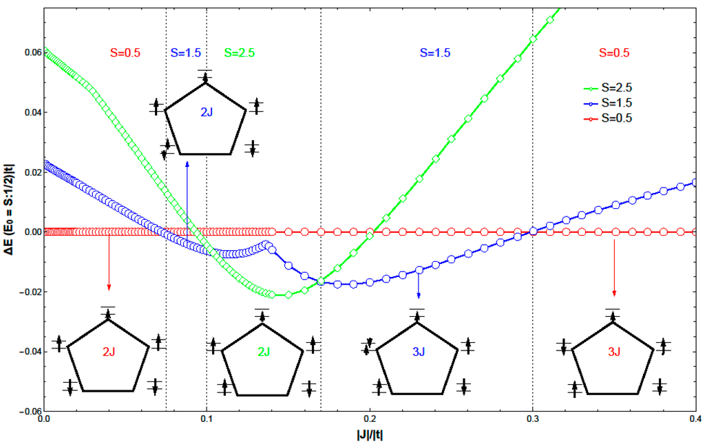 Energy differences between the various ground states and the lowest S = 1/2 state for the five-site cyclic system as functions of the antiferromagnetic coupling. The dominant determinants in the various spin ground states for and different values of are shown. The energetic contribution of the magnetic exchange in each of these determinants is indicated. The determinant having two opposite spins on the same center is combined with another determinant where the two spins are reversed, leading to a local triplet with ms = 0: .