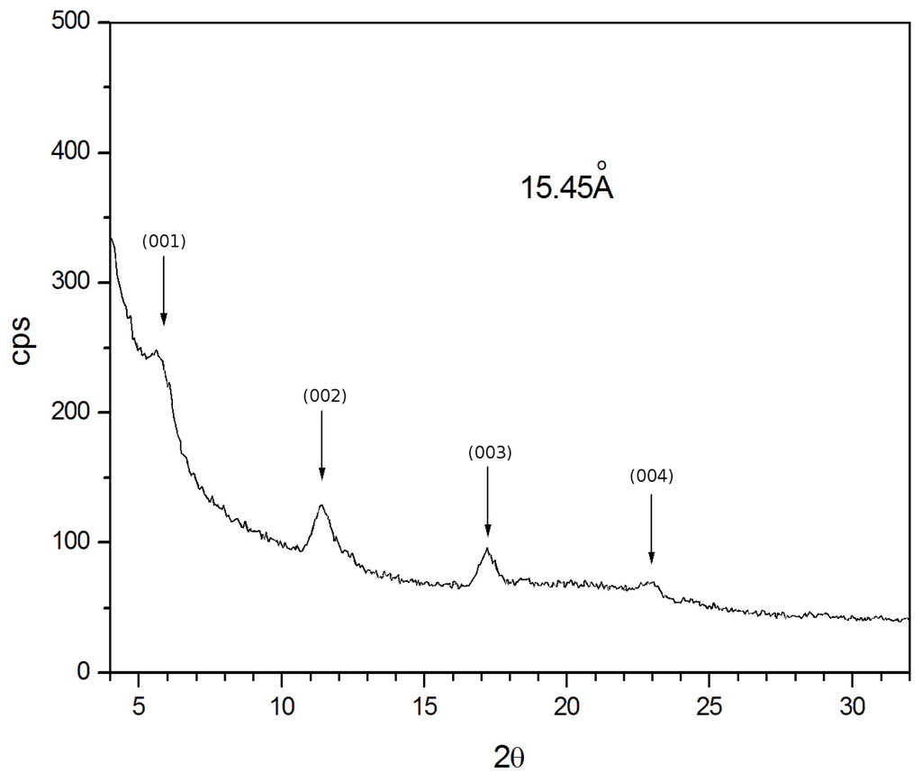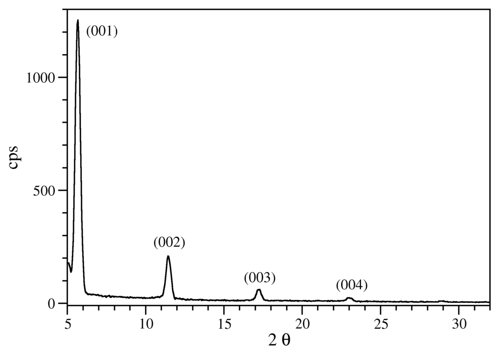 Grazing angle XRD measurements have been performed on the 10-017 sample. As shown in Figure 2, the film is clearly oriented (just one family of reflections) and the lattice spacing normal to the surface is = 15.45 Å, corresponding to the TF phase []. Clear, albeit very weak, peaks suggest the presence of the HT phase, but in a ratio that heavily favors the TF phase. The film thickness, as estimated from the low-angle fringe and by the width of the diffraction peaks, is about 10 nm, in agreement with ellipsometric measurements.