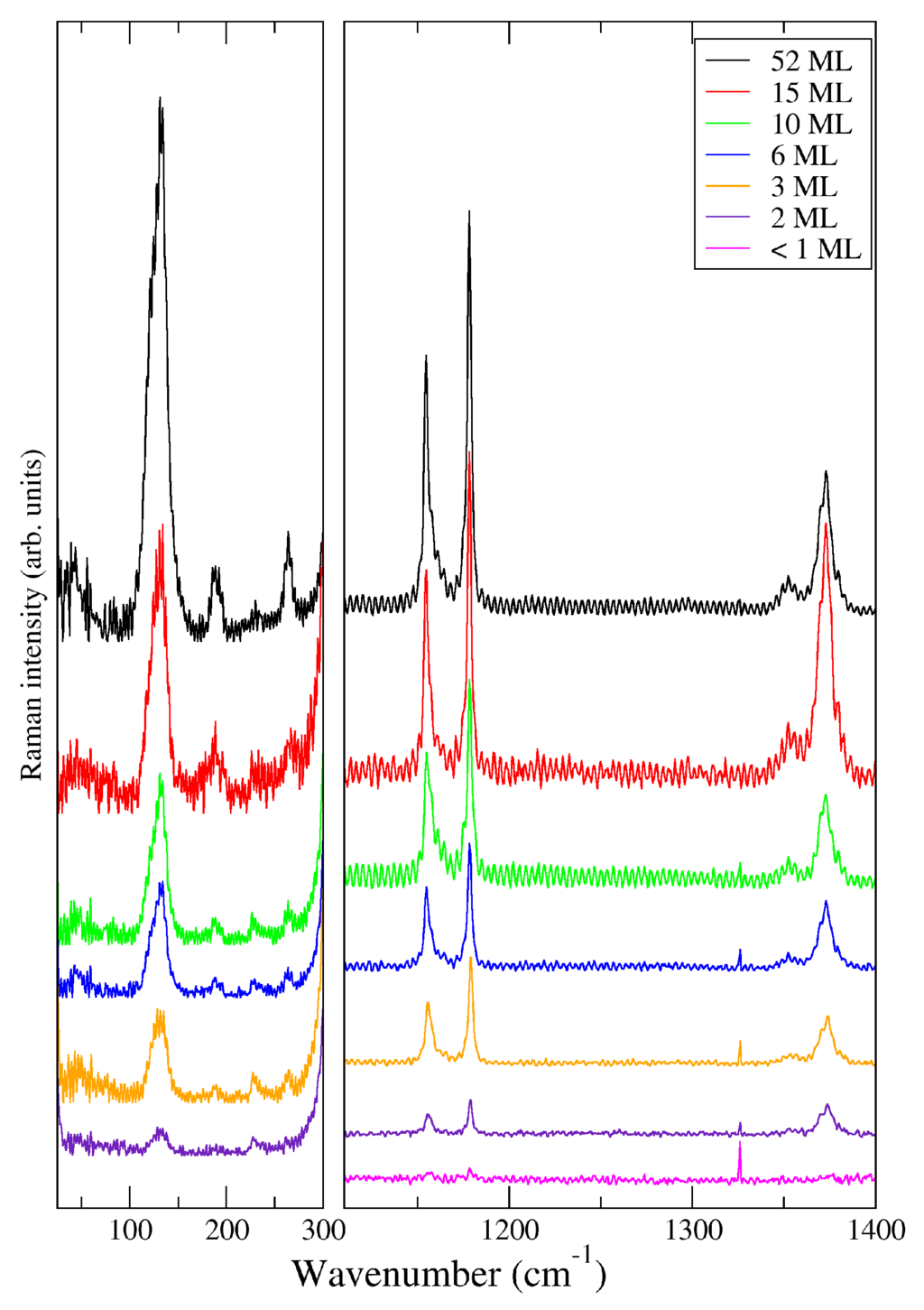 The order of the films is shown by the presence since the 2 ML film of a band around 130 cm, which has large character of a lattice mode []. The intensity of this band, compared to those of the high frequency modes, increases with the film thickness, indicating an increasing crystallinity. A more detailed discussion about the relation of the lattice phonons with film ordering will be made below.