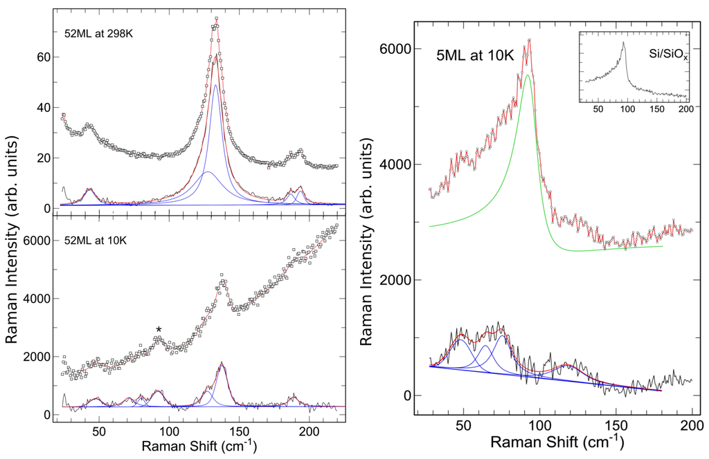 Left panels: Low-frequency Raman spectra of the 52 ML pentacene TF, at 298 K (top) and at 10 K (bottom). In both cases the upper curves are the raw experimental data, and the lower ones the data after fluorescence background subtraction. Spectral deconvolution is also shown as thin blue lines. The band marked with an asterisk might be due to the substrate. Right panel: Low-frequency Raman spectra of 5 ML pentacene TF at 10 K. Inset: Raman spectrum of the substrate alone. The upper curve is the spectrum, with overimposed in green the curve fitting of the inset Si/SiO spectrum. The lower curve is the spectrum after substrate spectrum subtraction, with the corresponding deconvolution (thin blue lines).
