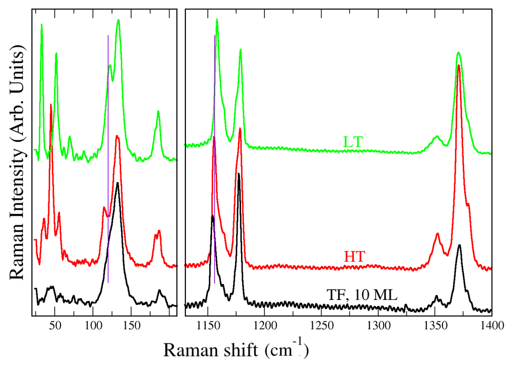 We finally compare in Figure 6 the Raman spectra of the three pentacene polymorphs, so as to put in evidence the differences that allow to distinguish and identify them. The spectra are all unpolarized, to avoid possible confusion deriving from the different polarization of the bands [,]. Violet vertical lines underline the points of greater difference. As it is well known [], the low-frequency region allows to easily distinguish the LT from the HT phase. This region is more difficult to use to identify the TF polymorph, because disorder broadens or washes out the bands. If the spectrum is at least partially observed, as in our case, the difference is more pronounced with respect to the LT polymorph in comparison with the HT one. On the other hand, the right side of Figure 6 demonstrates that the subtle differences in the CH bending frequency region allow not only to distinguish the LT from the HT phase, but also separates the TF one from the other two. In fact, the peak frequency of the band around 1150–1160 cm occurs at 1154, 1156 and 1158 cm for the TF, HT and LT polymorph, respectively, and also the band shape is different. Since precise calibration of the Raman frequency shifts is often delicate, we suggest to rather use the frequency difference with respect to the band around 1370 cm, which is in the order 217, 214 and 213 cm.