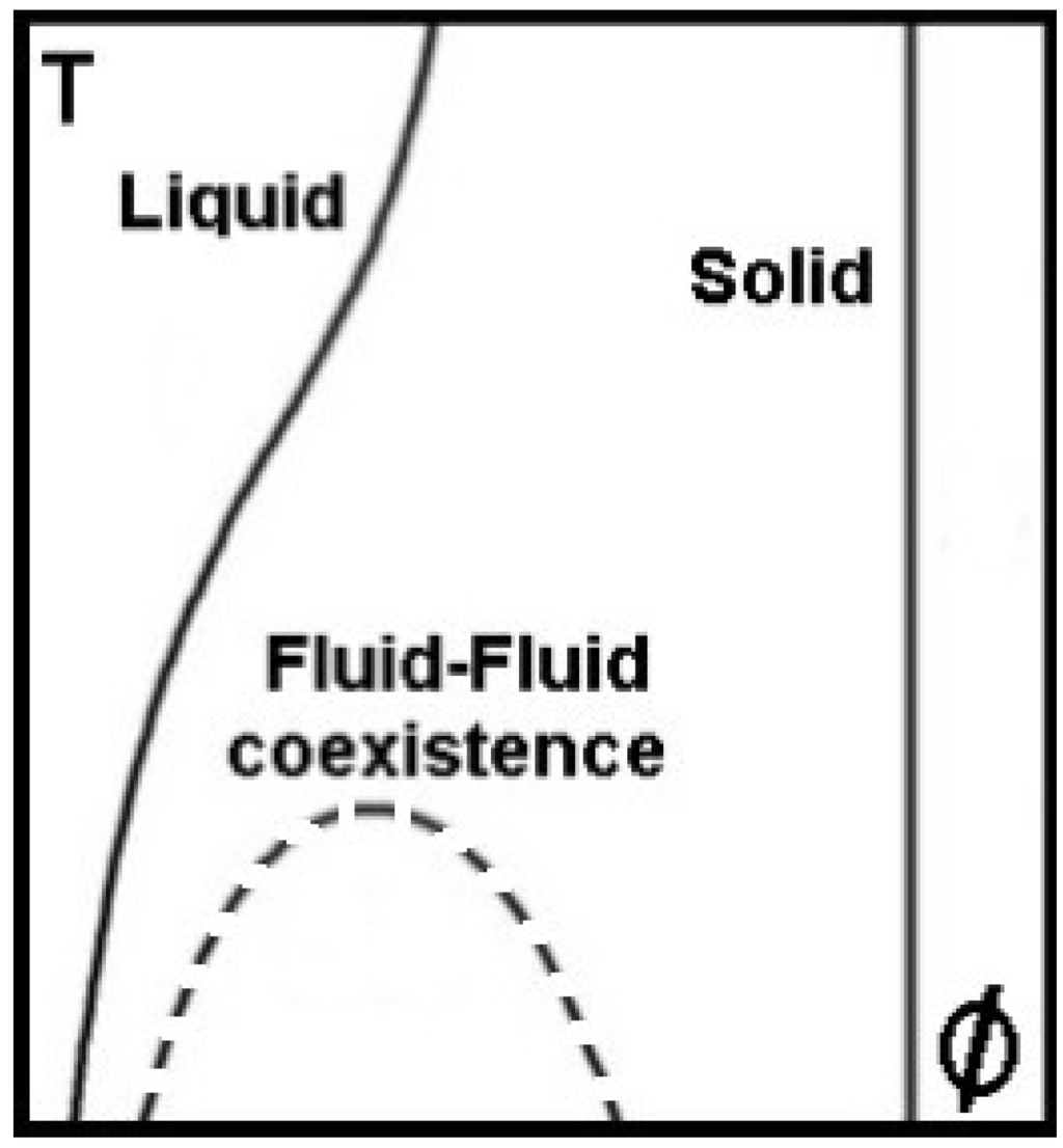 - Asherie, N.; Lomakin, A.; Benedek, G.B. Phase diagram of colloidal solutions. Phys. Rev. Lett. 1996, 77, 4832–4835. [Google Scholar] [CrossRef] [PubMed]