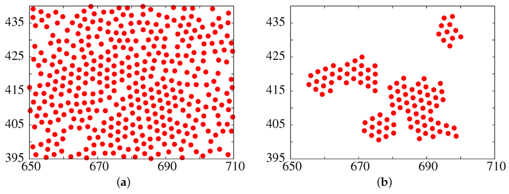 - González, A.E.; Martínez-López, F.; Moncho-Jordá, A.; Hidalgo-Álvarez, R. Two-dimensional colloidal aggregation: Concentration effects. J. Colloid Interface Sci. 2002, 246, 227–234. [Google Scholar] [CrossRef] [PubMed]