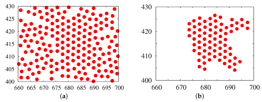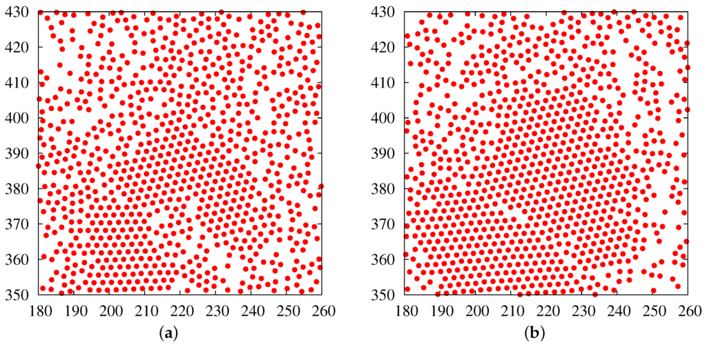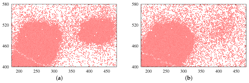 - Fraser, D.P.; Zuckermann, M.J.; Mouritsen, O.G. Simulation technique for hard-disk models in two dimensions. Phys. Rev. A 1990, 42, 3186–3195. [Google Scholar] [CrossRef] [PubMed]