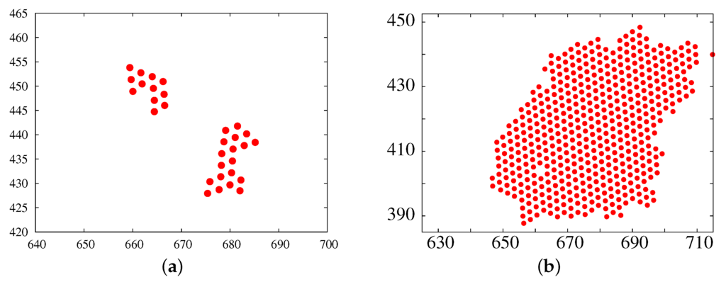 - González, A.E.; Ixtlilco-Cortés, L. Fractal structure of the crystalline-nuclei boundaries in 2D colloidal crystallization: Computer simulations. Phys. Lett. A 2012, 376, 1375–1379. [Google Scholar] [CrossRef]