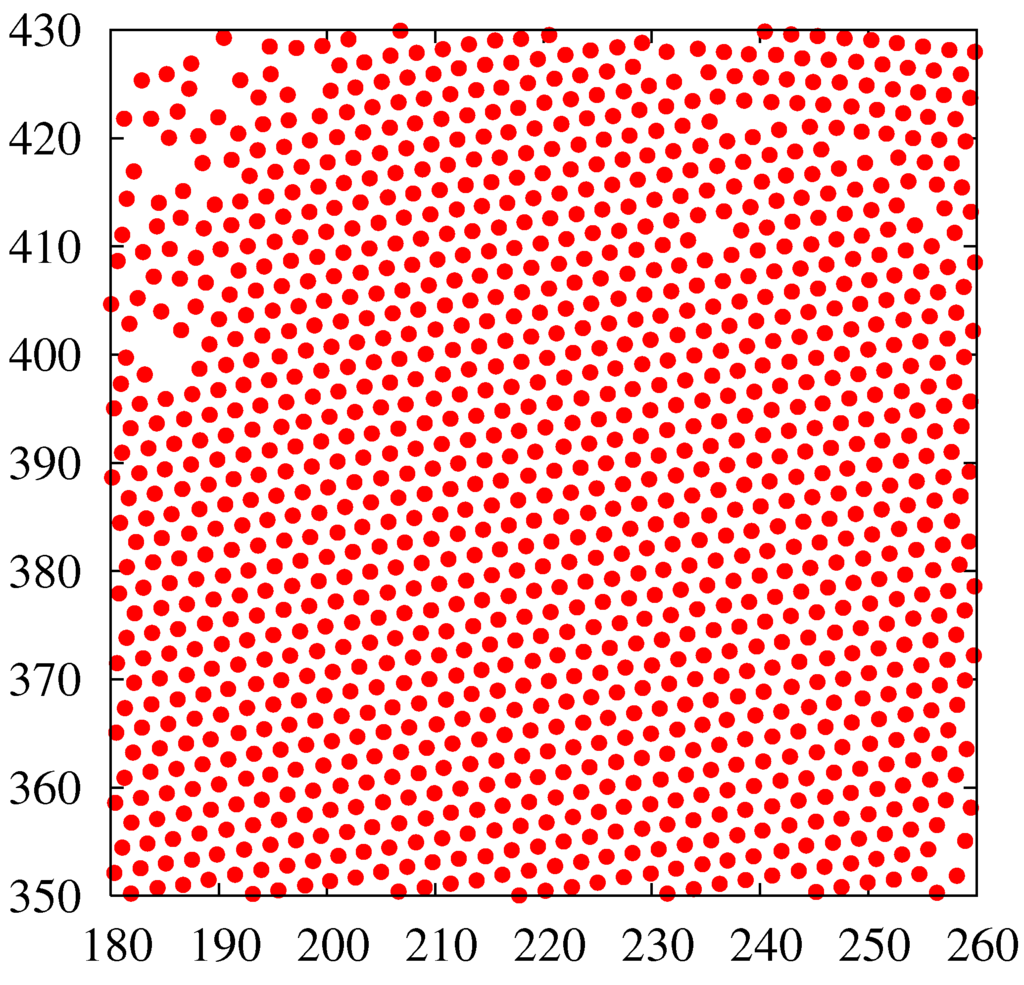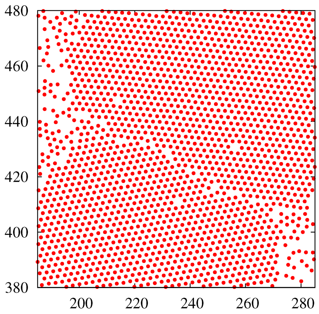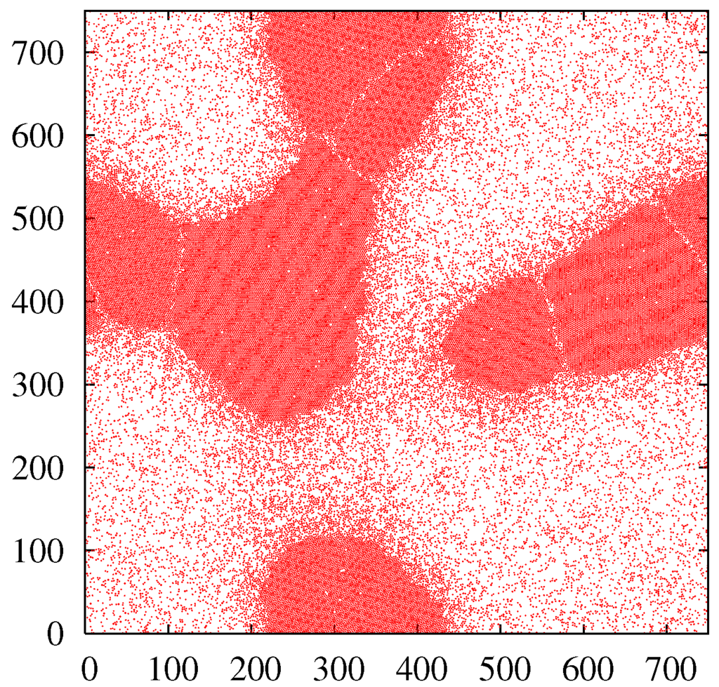 - Jaster, A. Computer simulation of the two-dimensional melting transition using hard disks. Phys. Rev. E 1999, 59, 2594–2602. [Google Scholar] [CrossRef]