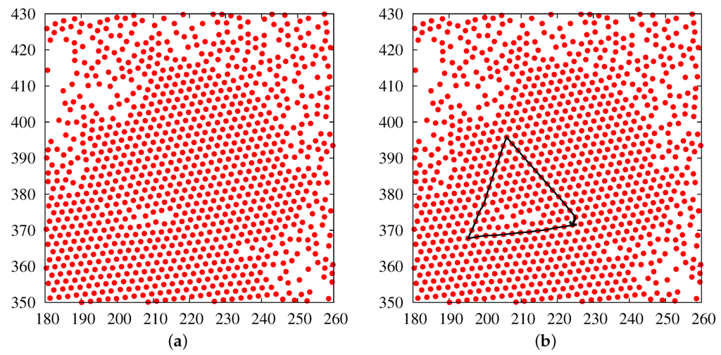 - Bladon, P.; Frenkel, D. Dislocation unbinding in dense two-dimensional crystals. Phys. Rev. Lett. 1995, 74, 2519–2522. [Google Scholar] [CrossRef] [PubMed]