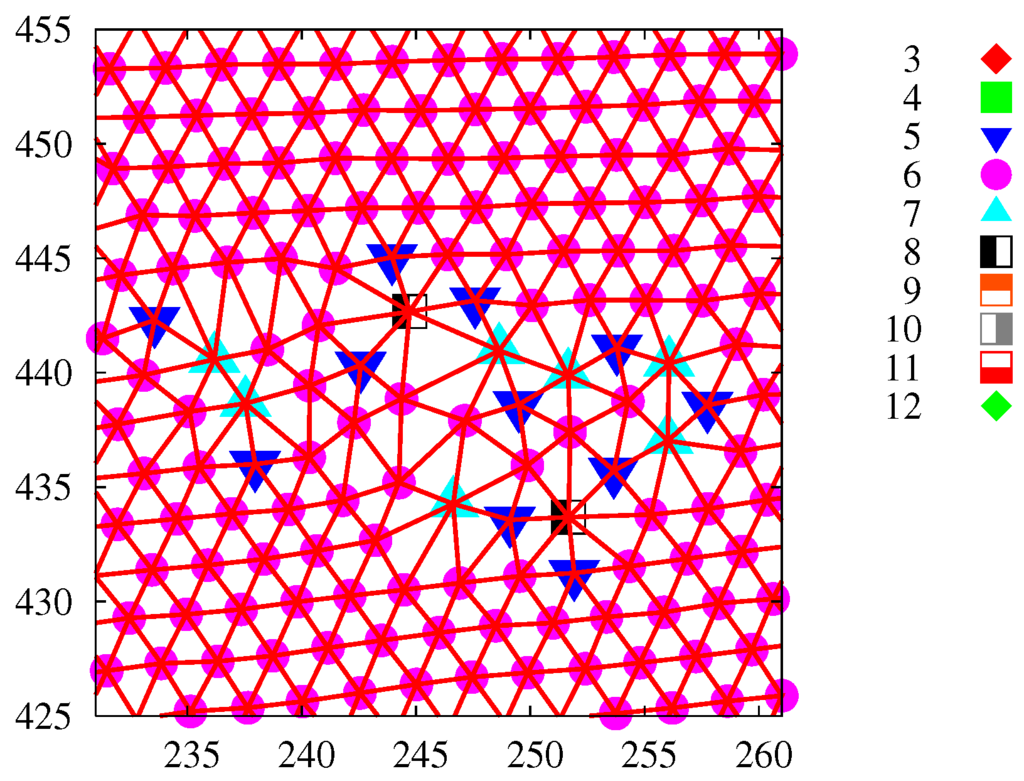 - Lansac, Y; Glaser, M.A.; Clark, N.A. Discrete elastic model for two-dimensional melting. Phys. Rev. E 2006, 73, 041501. [Google Scholar] [CrossRef] [PubMed]