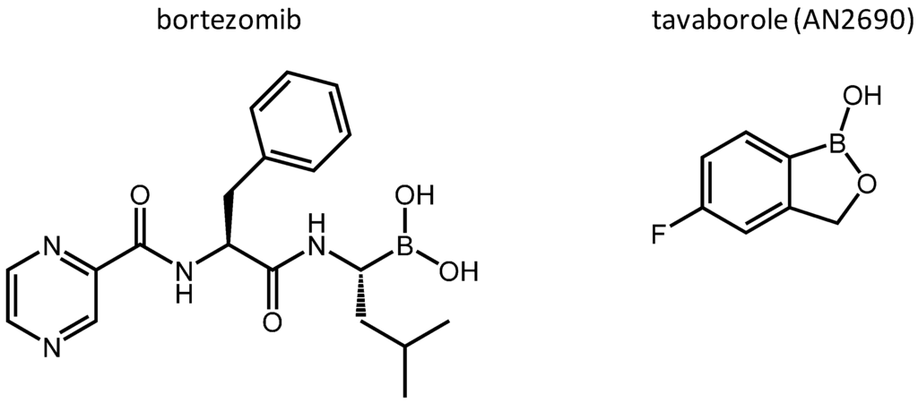 Representation of the structures of two organoboron drugs commercialized for their anti-cancer (left) and antifungal (right) properties.