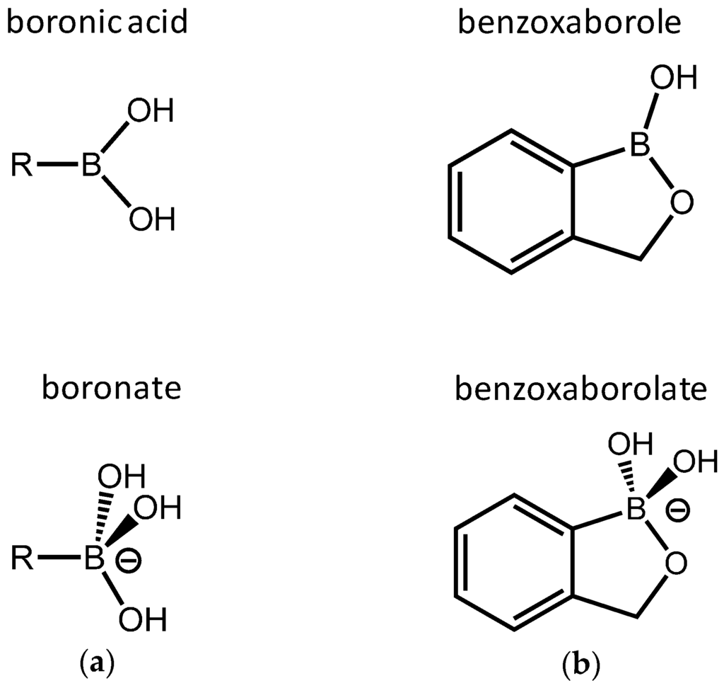 Representation of the structures of boronic acids/boronates (a); and benzoxaboroles/benzoxaborolates (b). Only the tetrahedral-boron forms of boronate/benzoxaborolate anions are shown here.
