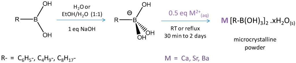 A series of investigations aiming at describing the intrinsic coordination properties of the R-B(OH)3− anions in materials have been reported [,,]. Boronic acids bearing non-coordinating R- chains were used for this purpose (R- = C6H5-, C4H9-, C8H17-), in order to ensure that the materials would form only based on the metal-ligand interactions. Reactions were carried out in water (or in water-ethanol mixtures), by adding a solution of a metal cation into a solution of the boronate (Figure 3), in order to precipitate a crystalline phase (e.g., a coordination polymer). Due to the high pKa values of the boronic acid/boronate couples, alkaline-earth metal cations were selected for the precipitation. Indeed, these ions should not lead to the competitive formation of metal-hydroxide precipitates during the reaction, in contrast with most other metal ions [].