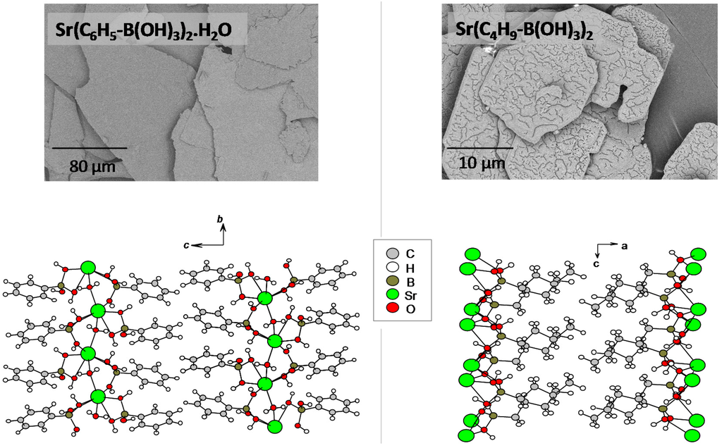 SEM images and crystal structures of Sr(C6H5-B(OH)3)2.H2O (left) and Sr(C4H9-B(OH)3)2 (right). Adapted with permission from [] (copyright American Chemical Society, 2011), [] (copyright Wiley-VCH Verlag 2013) and [] (copyright Actualité Chimique, 2014).