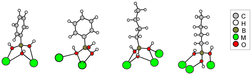Coordination modes of phenyl and butylboronate ligands with respect to alkaline earth metals (M = Ca, Sr) [,,]. For the octylboronate ligand, the same binding mode as for the butylboronate was observed []. Adapted with permission from [] (copyright American Chemical Society, 2011), [,] (copyright Wiley-VCH Verlag 2013 and 2015) and [] (copyright Actualité Chimique, 2014).
