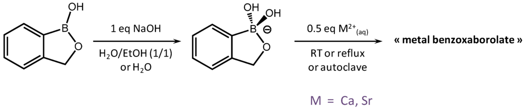 The synthetic strategy used in the case of benzoxaborolates is the same as for the boronates. The simplest benzoxaborolate (Figure 2b) was precipitated using an aqueous solution of alkaline earth metal, the reaction being carried out at room temperature, under reflux, or using hydrothermal conditions (Figure 6) []. In the vast majority of cases, microcrystalline precipitates were obtained, except for two phases, for which single crystals suitable for X-ray diffraction analyses were isolated.