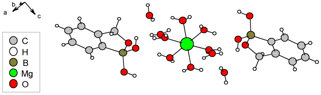 To date, the structures of three phases have been solved: two involving Mg2+ and one Ca2+ []. Although these structures have an overall layered organization, as shown by powder X-ray diffraction analyses, the benzoxaborolates here play two different roles: either they bridge different metal cations, or they simply serve as counter-anions, as illustrated in Figure 7 for the Mg-benzoxaborolate decahydrate phase.