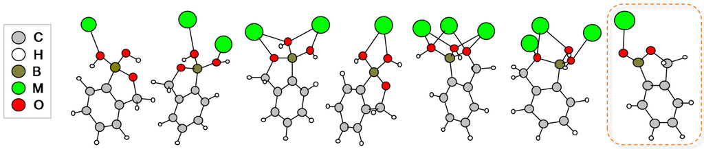 Coordination modes of the simplest benzoxaborolate ligand with respect to alkaline earth metals (M = Mg, Ca). The deprotonated benzoxaborolate found in the Ca structure is outlined in dashed orange. Adapted with permission from [] (copyright American Chemical Society, 2015).