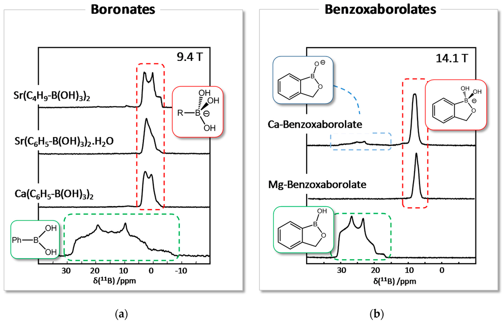 11B solid state NMR spectra of alkaline-earth metal boronates (a) and benzoxaborolates (b), as well as for the corresponding boronic acid and benzoxaborole. The spectra shown here were recorded under MAS at two different magnetic fields (9.4 T for boronic acids, vs. 14.1 T for benzoxaboroles), and present second order quadrupolar lineshapes. Adapted with permission from [] (copyright American Chemical Society, 2015).