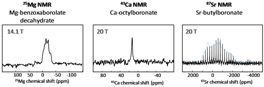 Another way to gain insight into the structure of coordination networks involving boronate and benzoxaborolate ligands consists of studying the NMR signatures of the metal ions to which they are bound. Most of the crystalline structures mentioned above have been characterized using 25Mg, 43Ca and 87Sr solid state NMR, as illustrated in Figure 10. Alkaline earth metals are very challenging for NMR, due to their low resonance frequency, low natural abundance, and/or large quadrupole moment, and their isotopic enrichment is costly [,,]. Nevertheless, 25Mg, 43Ca, and 87Sr NMR spectra can provide important clues concerning the local environments of the metals. In particular, δiso(43Ca) is highly informative about the local structure around calcium, and it was shown that it could be used as a very sensitive probe for positioning the boronate O-H groups around the Ca2+, using a combined experimental-computational approach based on advanced DFT calculations [].