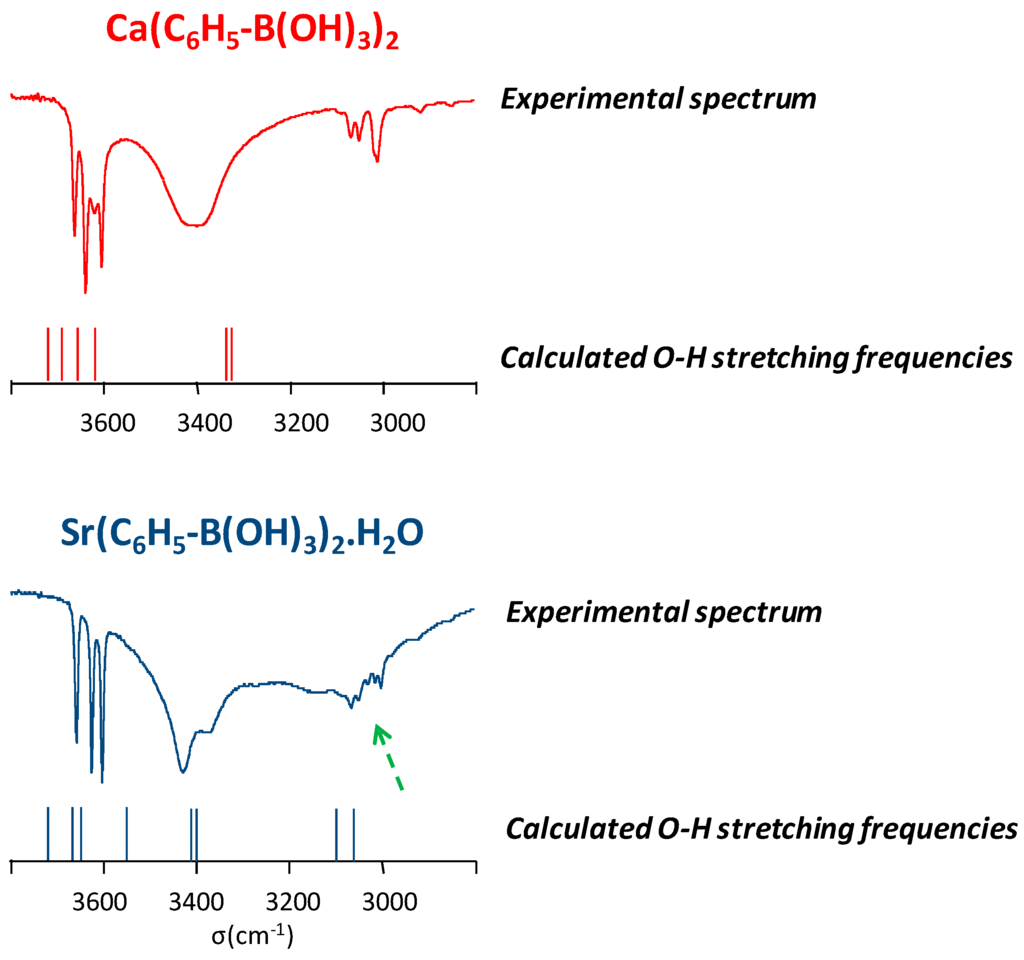 Portion of the experimental IR spectra of the Ca-phenylboronate and Sr-phenylboronate monohydrate phases, and representation of the DFT-calculated O-H stretching frequencies for these structures. The dashed green arrow points to the O-H bands identified as belonging to the water molecules (beneath the aromatic C-H stretching frequencies). Adapted with permission from [] (copyright Wiley-VCH, 2013), and [] (copyright Wiley-VCH, 2015).