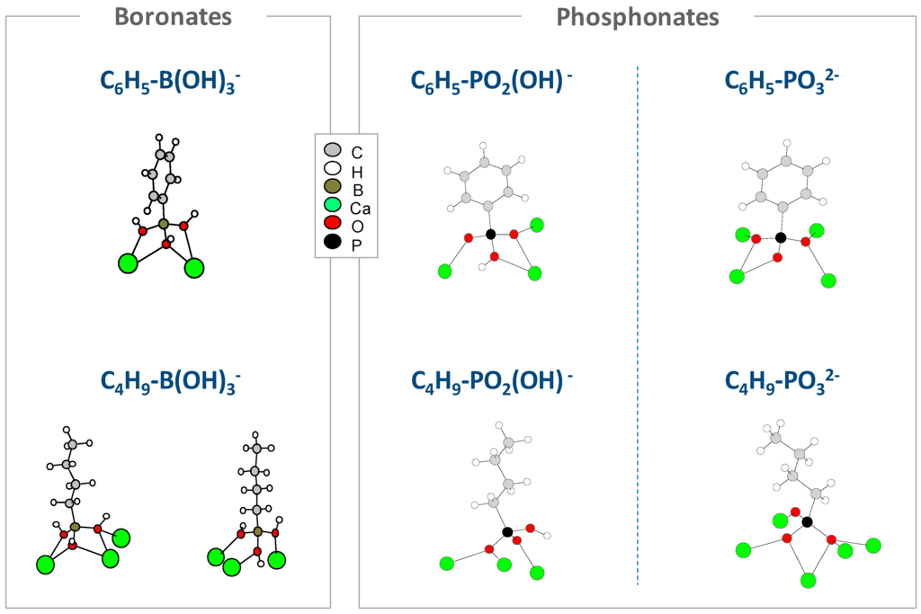 Comparison of the coordination modes observed for phosphonates and boronates with respect to calcium in different crystal structures. Adapted with permission from [] (copyright American Chemical Society, 2011), [,] (copyright Wiley-VCH Verlag 2013 and 2015), [] (copyright Actualité Chimique, 2014), and [] (copyright Royal Society of Chemistry 2013).