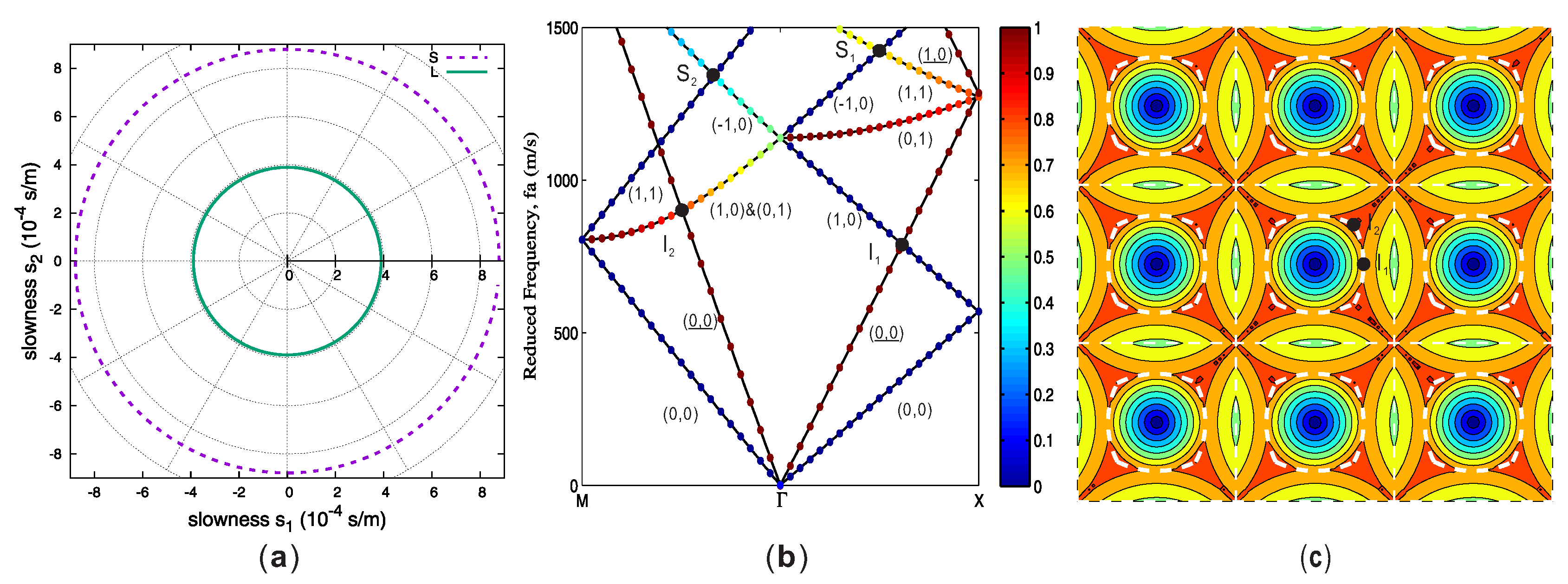 Finally, we consider the case of Z-cut rutile in the X orientation. Though anisotropic, the slowness curves plotted in Figure 5a have the symmetry of the square lattice. Lowest intersections between quasi-shear cones in Figure 5b are then exactly the same as the boundaries of the first BZ. Other intersections, however, can appear inside the first BZ. Figure 4e and Figure 5c show the isofrequency curves corresponding to the second band for the X orientation and for the X orientation, respectively. Intersections of the QS and QL Bloch waves are shown in thick dashed lines. They both locate inside the first BZ.