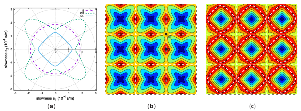 In this section, we consider the most general case, the empty lattice model for vector waves propagating in anisotropic solids. For definiteness, examples are shown for rutile (TiO, tetragonal crystal). The crystallographic orientation is chosen to be the Z-cut, that is the Z crystallographic axis is parallel to the -axis of the reference frame in Figure 1a. The orientation we consider here is X, meaning the -axis is obtained from the X crystallographic axis by a rotation by about the -axis. Slowness curves are shown in Figure 4a. There are 3 bulk elastic waves: a pure shear wave polarized along the -axis, and a quasi-shear (QS) and a quasi-longitudinal (QL) waves polarized in-plane. The pure shear wave case is identical with the analysis in Section 2.2, so we focus mostly on the QS and QL waves in this section. In the anisotropic case it is not generally possible to simplify analytical expressions for the empty lattice model from Section 2.1 as we did previously for the isotropic case.