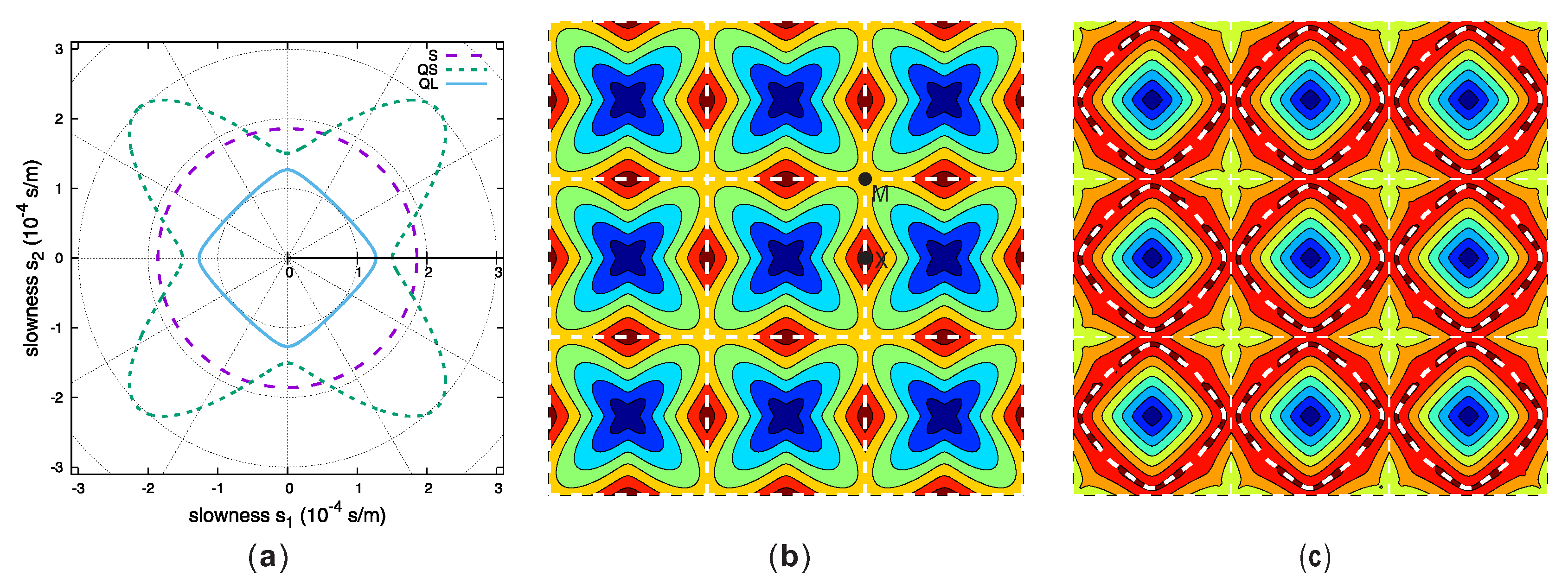 Empty lattice model for in-plane polarized waves in Z-cut rutile. (a) The three slowness curves are for a pure shear wave (long dashed line), a QS wave (short dashed line) and a QL wave (solid line). (b) Isofrequency curves are plotted for the first band of in-plane waves. The thick dashed lines represent the intersections between adjacent QS cones. (c) Isofrequency curves are plotted for the second band of in-plane waves. The thick dashed lines show the first intersection between QS and QL cones.