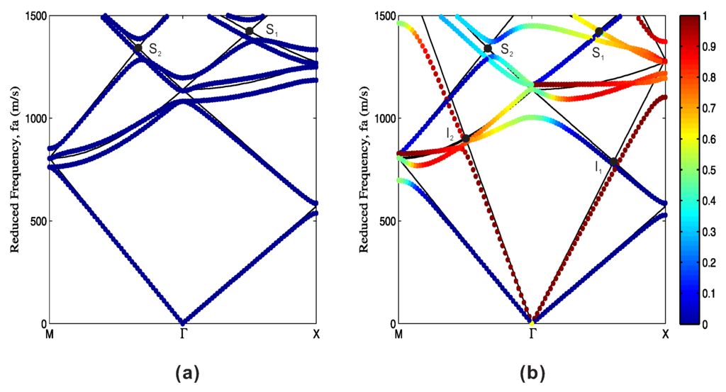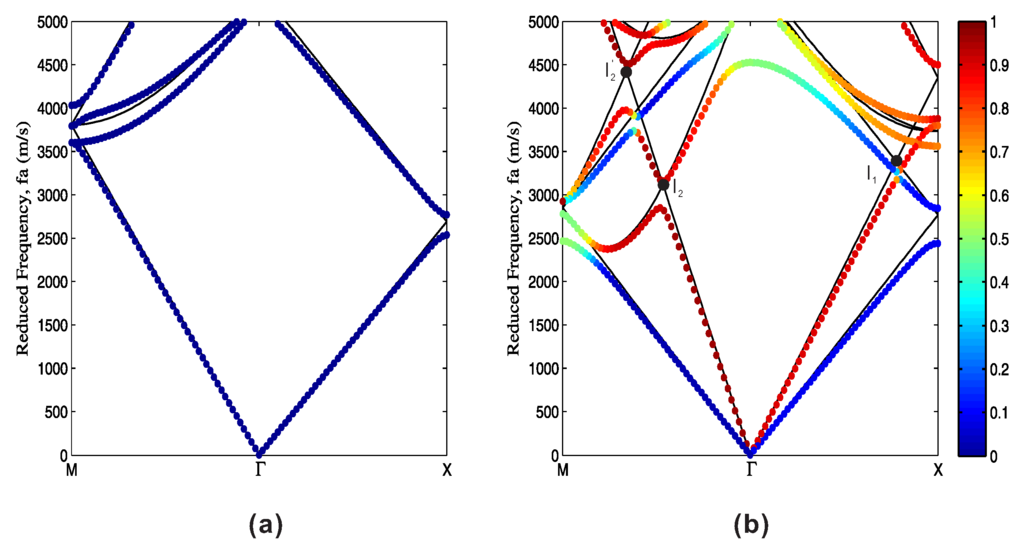 For in-plane polarized waves in Figure 6b and Figure 7b, avoided crossings occur not only at the high symmetry points, but also inside the first BZ (for instance the first intersections I and I of the QS and QL branches in the Γ-M direction). It is noteworthy that no avoided crossing is formed at I. The reason for the different behavior at I and I is that in the Γ-M direction the (1, 0) shear wave has a polarization not orthogonal to the (0, 0) longitudinal wave; hence an avoided crossing is expected to appear at I when a periodic modulation is applied. In the Γ-X direction, however, the two waves remain orthogonal, and the orthogonality is preserved by the symmetry of the phononic crystal lattice. Consequently, no avoided crossing appears at I. All avoided crossings appear at intersections of the empty-lattice band structure. Similar results were found in two-dimensional phononic crystals with isotropic solid components [17] or holes in a piezoelectric matrix [18], where avoided crossing is generally accompanied by a transfer of the polarization from one branch to the other. It is also noted that the intersection point I in Figure 7b can be tuned by changing the orientation of the anisotropic solid. A relatively large band gap could thus be expected when the frequencies of points I and M are the same.