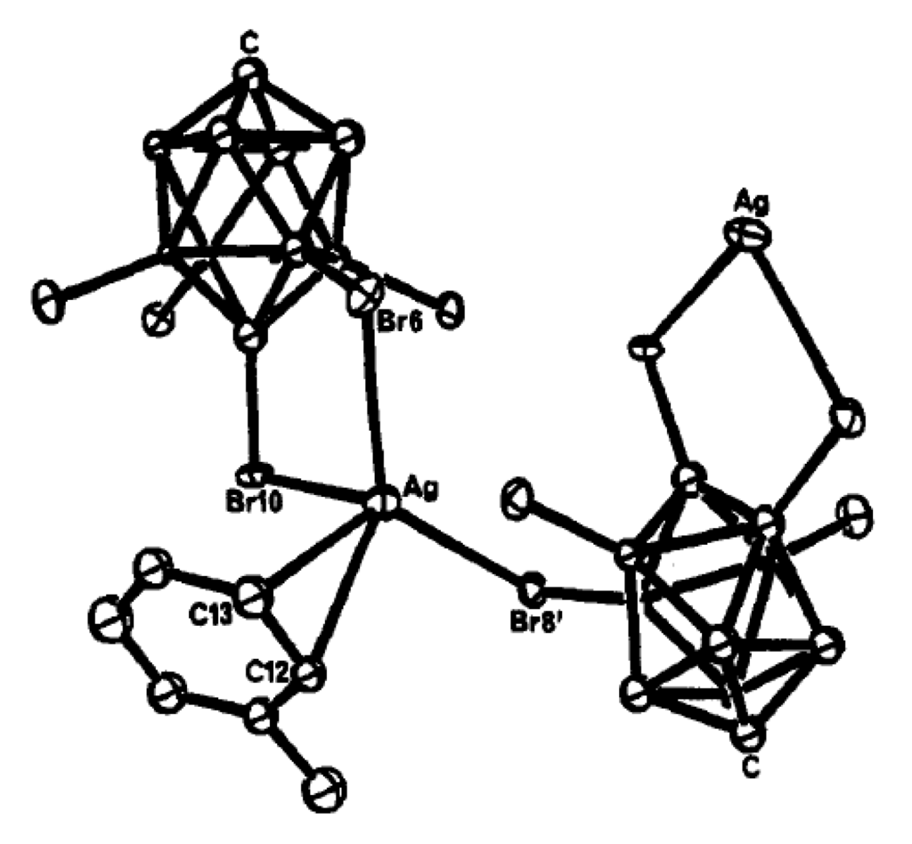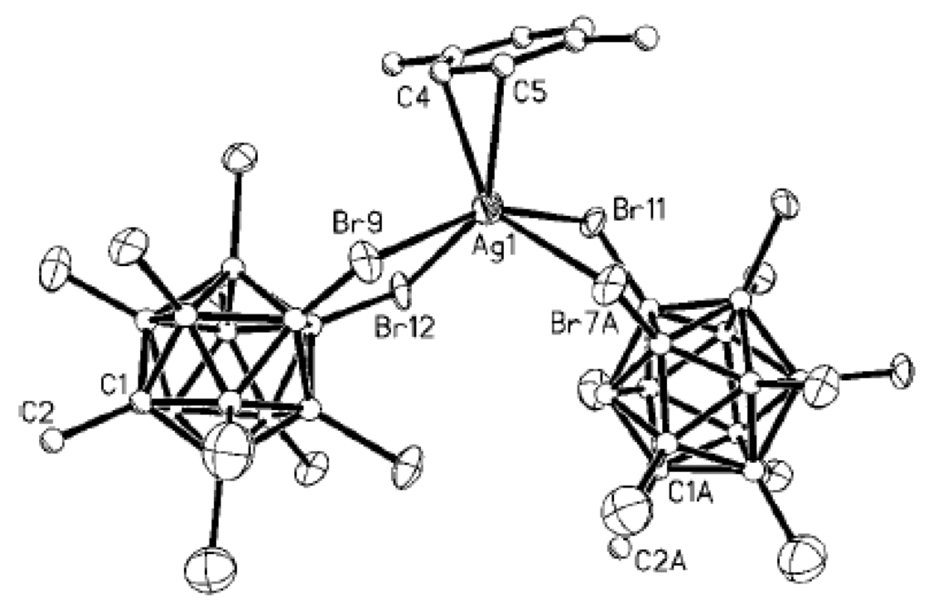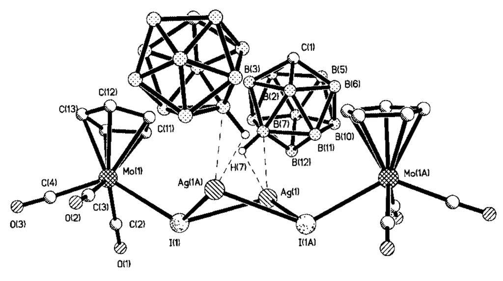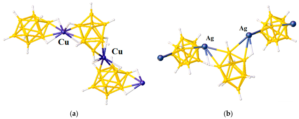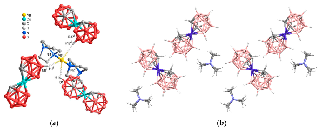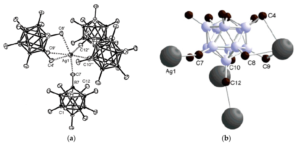 In coordination chemistry, silver(I) is able to adopt a wide variety of coordination geometries with coordination numbers varying from 2 to 8. This variety is mainly due to the lack of stereochemical preference that arises from the d10 configuration. Furthermore, the weak nature of the silver-ligand bond means that in the solid state, weak interactions and crystal packing forces have a greater influence on structure than may be expected in more robust metal–ligand systems [8,9,10]. Copper(I) has the same d10 configuration and its coordination chemistry in some cases resembles coordination chemistry of silver(I) [11]. The availability of a number of silver and copper salts makes it easy to analyze the effects counter-anions have on the structure of supramolecular networks, such as their ability to coordinate to the metal center. Therefore, synthesis and X-ray structure studies of silver and copper salts of new types of weakly coordinating anions are of great importance. Several review papers concerning different aspects of chemistry of silver and copper complexes of polyhedral boranes and carboranes were published during the recent years [12,13,14].