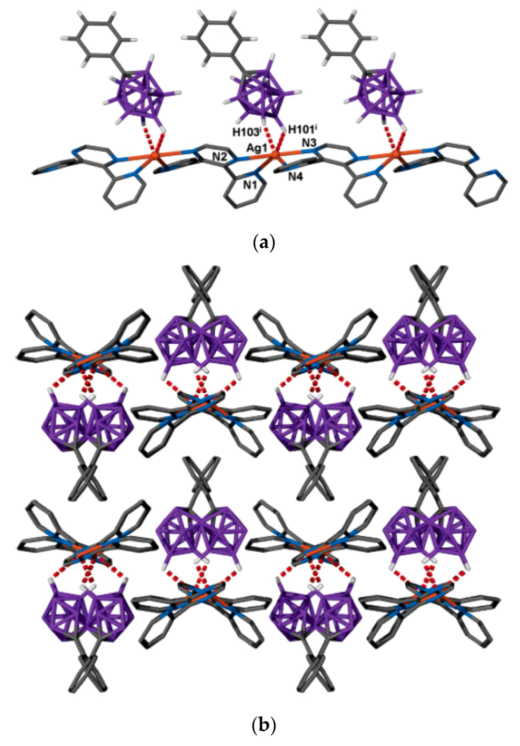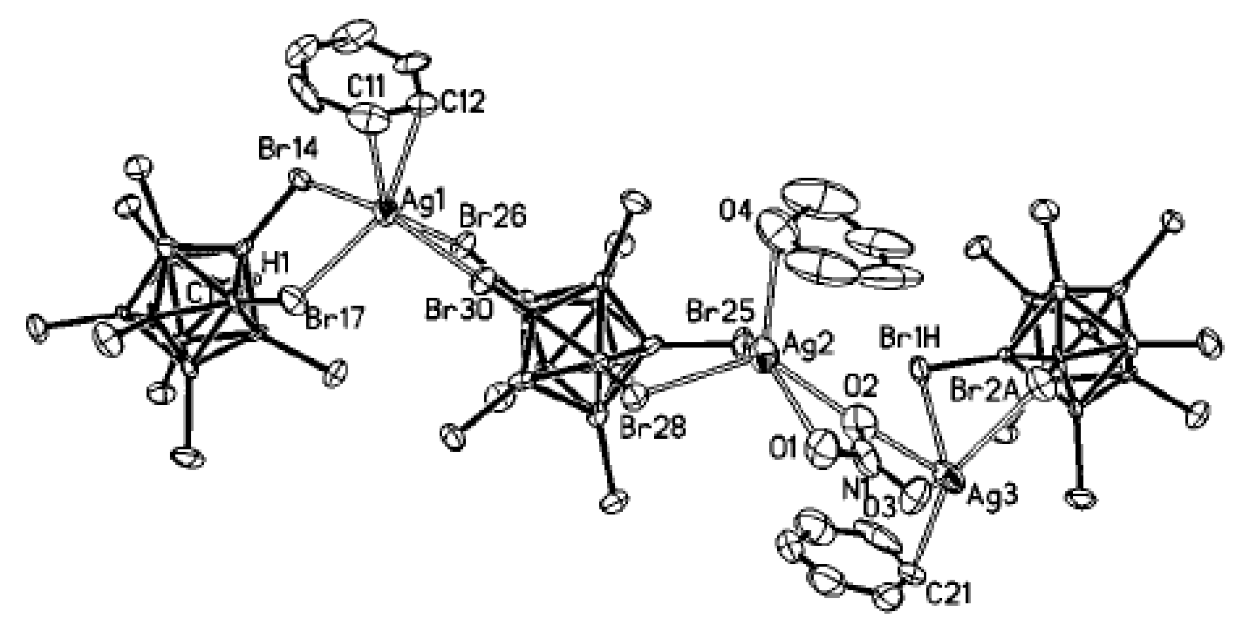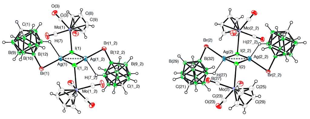 In coordination chemistry, silver(I) is able to adopt a wide variety of coordination geometries with coordination numbers varying from 2 to 8. This variety is mainly due to the lack of stereochemical preference that arises from the d10 configuration. Furthermore, the weak nature of the silver-ligand bond means that in the solid state, weak interactions and crystal packing forces have a greater influence on structure than may be expected in more robust metal–ligand systems [8,9,10]. Copper(I) has the same d10 configuration and its coordination chemistry in some cases resembles coordination chemistry of silver(I) [11]. The availability of a number of silver and copper salts makes it easy to analyze the effects counter-anions have on the structure of supramolecular networks, such as their ability to coordinate to the metal center. Therefore, synthesis and X-ray structure studies of silver and copper salts of new types of weakly coordinating anions are of great importance. Several review papers concerning different aspects of chemistry of silver and copper complexes of polyhedral boranes and carboranes were published during the recent years [12,13,14].